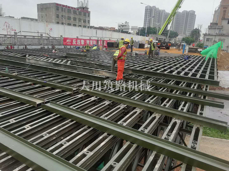 鋼橋型號(hào):48m*16m加強(qiáng)型6(車道)+2(人行通道)+防撞護(hù)欄,上承式鋼橋,橫向布置35排貝雷梁,分兩跨,橋墩為單排四柱式φ800鋼管樁,上表鋪混泥土。